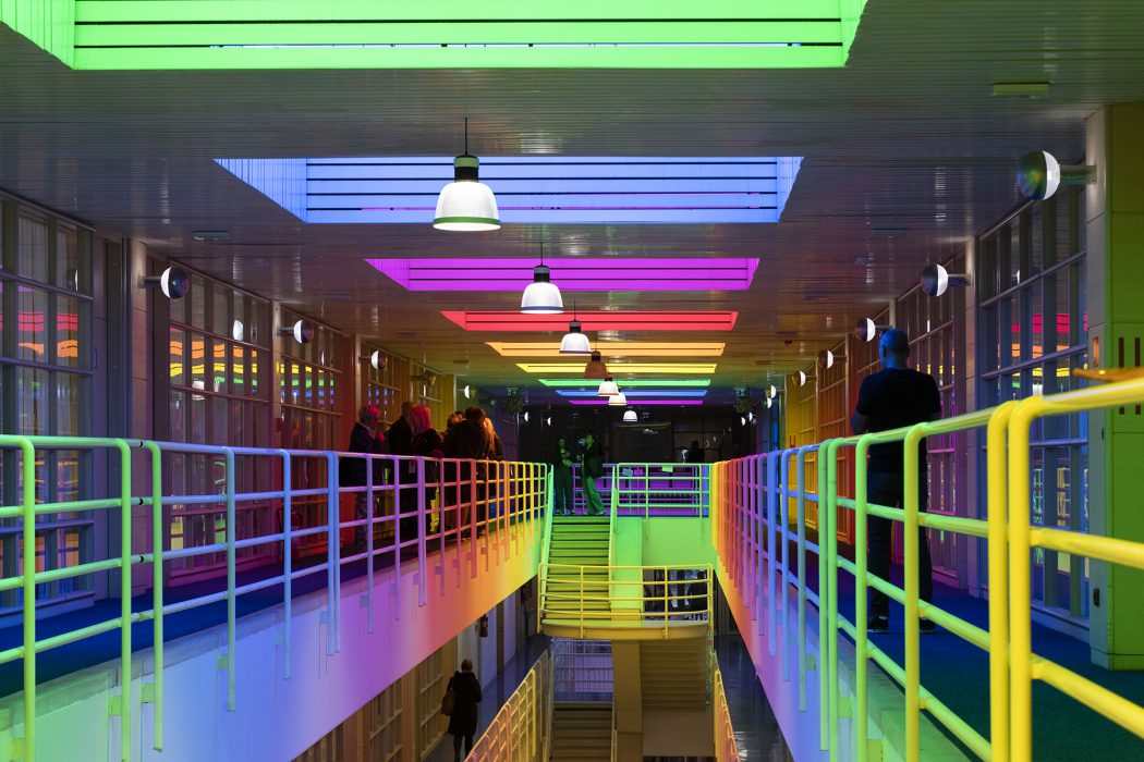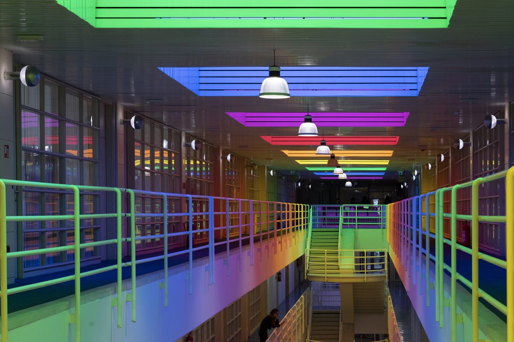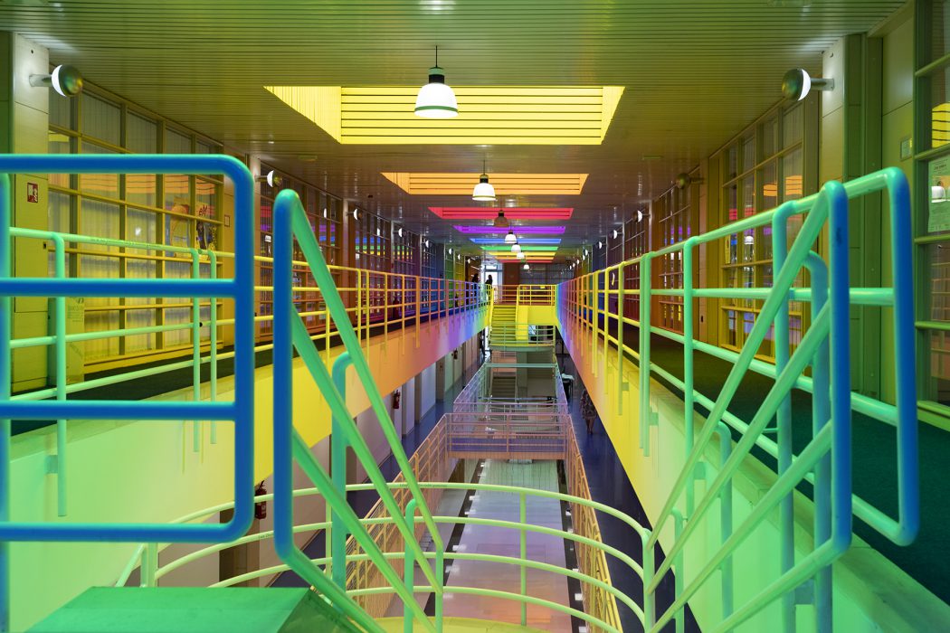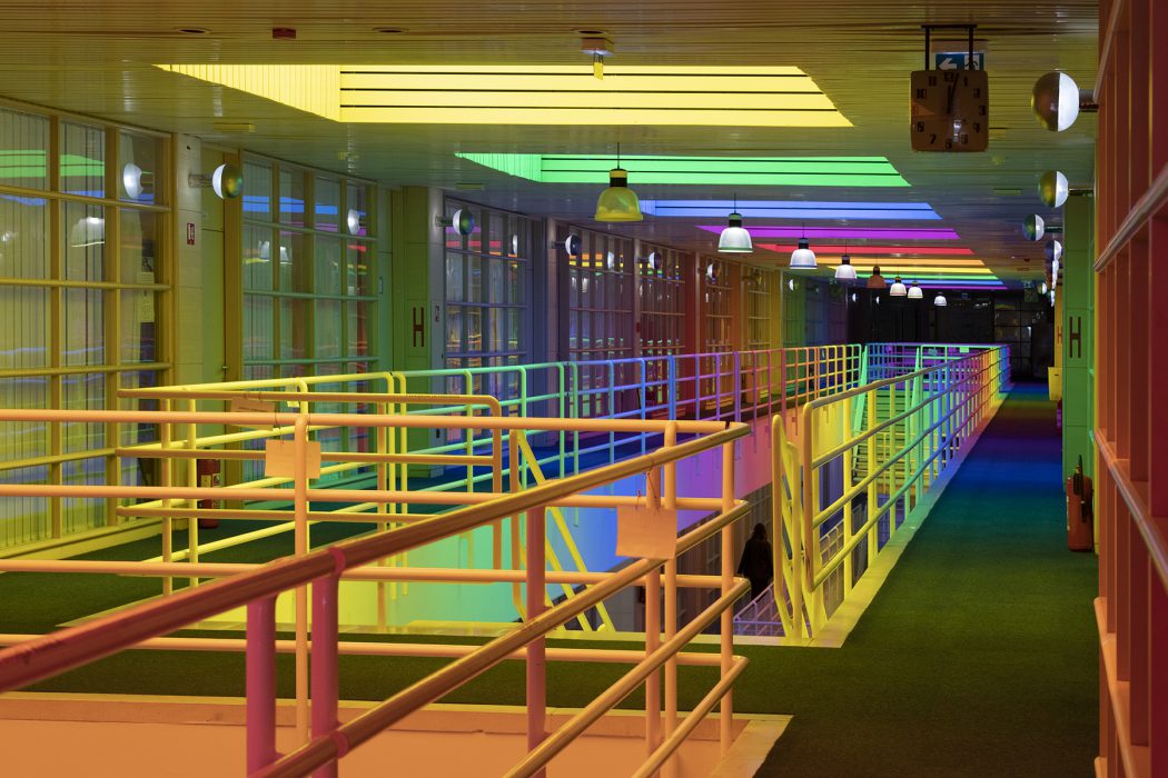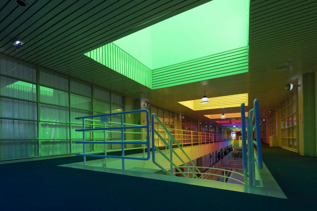 It is important to note that Neli Ružić has recently returned to Itten’s seminal work The Art of Color, one of the fundamental theoretical anchors for understanding color in twentieth-century art. She is particularly inspired by his observations on the mosaic masters of Ravenna, who in the fifth and sixth centuries achieved striking variations by relying on the action of complementary colors. In the Mausoleum of Galla Placidia, for example, the blue surfaces of wall mosaics are illuminated by orange light entering the sacred space through narrow alabaster windows. Since blue and orange are complementary colors that merge perceptually into grey, the space is filled with a marvellous grey light of changing intensity, depending on the viewer’s movement and the angle of incoming light. For Itten, this phenomenon demonstrates how color and light are not static but, in their interplay, become a dynamic experience of a space. Ružić similarly relies on perceptual instability. Her interventions are not stable images but experiences that depend on the viewer’s position, the passage of light, and the time of day. While Itten finds in Ravenna a point of departure for understanding the historical dynamics of color, Ružić translates this dynamic into the contemporary institutional space, revealing how similar optical-affective processes can be activated within the contexts of education and social dialogue. Even more importantly, Itten emphasises in his analyses the physiological effects of color. For example, cool tones such as blue-green evoke a sensation of lower temperatures, while warm tones such as red-orange create an impression of warmth and can even stimulate circulation. It is along these lines that we may also interpret Ružić’s work. Color is not merely an optical layer of architecture but also a physiological stimulus, affecting the body as much as perception. If Itten shows that cool and warm tones provoke diverse bodily reactions, the artist translates these effects into collective experience, into an atmosphere that transforms how a community perceives its educational space. This confirms that color is much more than visual appearance; it is an agent that simultaneously shapes perception, emotions, and the embodied experience of space.