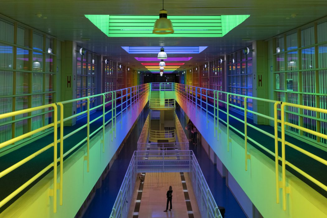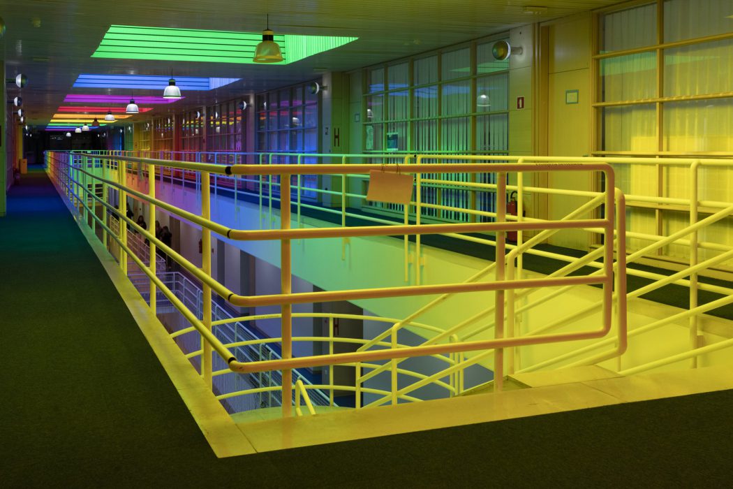 Furthermore, this spatial gesture at the Faculty of Humanities and Social Sciences in Split inscribes itself into the continuity of Neli Ružić’s artistic practice, in which color acts as a means of resistance, self-recognition, and emancipation. In her performative work Sunbathing in Colors, realised at the Protiron Gallery in 1997, the artist exposed her own body to color in an act stemming from the experience of solitary pregnancy and the anticipation of life as a single mother. This experience of vulnerability and uncertainty did not remain confined to the private sphere but became a paradigmatic example of the relation between limitation and freedom, between constraint and possibility. The colors that covered the body, were triggered by anomalies within a regime of social condemnation, but they transformed into a sign of hope, into the possibility of opening a space for multiple identities and affective dissonances. In All at Once, the colors shift from body to architecture, from the personal to the collective, while retaining their force and persistence. A similar process of “coloring” was employed in her spatial intervention and video work The Stolen Future(2014/2015), where Ružić illuminated the abandoned pavilions of Ivan Vitić’s motel in Trogir with light and color. The devastated modernist complex thereby acquired new visibility, with color appearing both as an invocation of modernism’s utopian promises and as an indication of the entropy of the transitional period. The Stolen Futurethus opened a space for imagining different scenarios, in which the immateriality of light evoked “past futures” and possible alternatives to the present.